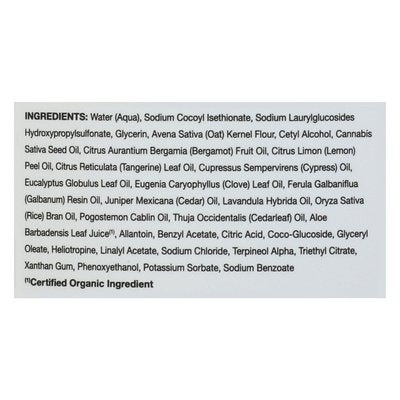 INGREDIENTS: Water (Aqua), Sodium Cocoyl Isethionate, Sodium Laurylglucosides Hydroxypropylsulfonate, Glycerin, Avena Sativa (Oat) Kernel Flour, Cetyl Alcohol, Cannabis Sativa Seed Oil, Citrus Aurantium Bergamia (Bergamot) Fruit Oil, Citrus Limon (Lemon) Peel Oil, Citrus Reticulata (Tangerine) Leaf Oil, Cupressus Sempervirens (Cypress) Oil, Eucalyptus Globulus Leaf Oil, Eugenia Caryophyllus (Clove) Leaf Oil, Ferula Galbaniflua (Galbanum) Resin Oil, Juniper Mexicana (Cedar) Oil, Lavandula Hybrida Oil, Oryza Sativa (Rice) Bran Oil, Pogostemon Cablin Oil, Thuja Occidentalis (Cedarleaf) Oil, Aloe Barbadensis Leaf Juice (Certified Organic Ingredient), Allantoin, Benzyl Acetate, Citric Acid, Coco-Glucoside, Glyceryl Oleate, Heliotropine, Linalyl Acetate, Sodium Chloride, Terpineol Alpha, Triethyl Citrate, Xanthan Gum, Phenoxyethanol, Potassium Sorbate, Sodium Benzoate.
