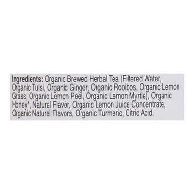 INGREDIENTS: Organic Brewed Herbal Tea (Filtered Water, Organic Tulsi, Organic Ginger, Organic Rooibos, Organic Lemon Grass, Organic Lemon Peel, Organic Lemon Myrtle), Organic Honey, Natural Flavor, Organic Lemon Juice Concentrate, Organic Natural Flavors, Organic Turmeric, Citric Acid.