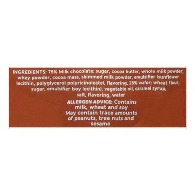 INGREDIENTS: 75% Milk Chocolate, Sugar, Cocoa Butter, Whole Milk Powder, Whey Powder, Cocoa Mass, Skimmed Milk Powder, Emulsifier (Sunflower Lecithin, Polyglycerol Polyricinoleate), Flavoring (Vanillin), 25% Wafer, Wheat Flour, Sugar, Emulsifier (Soy Lecithin), Vegetable Oil, Caramel Syrup, Salt, Flavoring (Vanillin), Water.