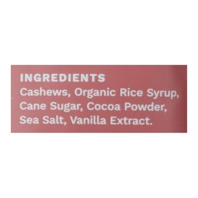 INGREDIENTS: Cashews, Organic Rice Syrup, Cane Sugar, Cocoa Powder, Sea Salt, Vanilla Extract.