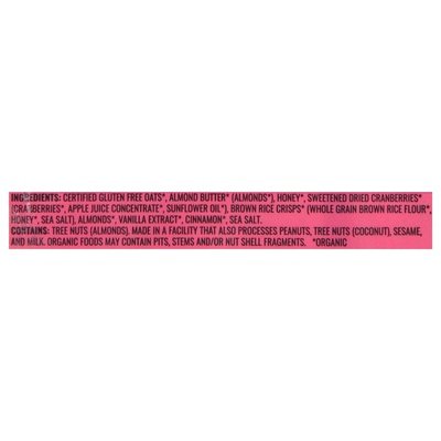 INGREDIENTS: Certified Gluten Free Oats (Organic), Almond Butter (Organic) (Almonds (Organic)), Honey (Organic), Sweetened Dried Cranberries (Organic) (Cranberries (Organic), Apple Juice Concentrate, Sunflower Oil (Organic)), Brown Rice Crisps (Whole Grain Brown Rice Flour (Organic), Honey, Sea Salt), Almonds (Organic), Vanilla Extract (Organic), Cinnamon (Organic), Sea Salt.