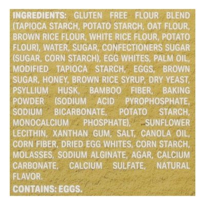 INGREDIENTS: Gluten Free Flour Blend (Tapioca Starch, Potato Starch, Oat Flour, Brown Rice Flour, White Rice Flour, Potato Flour), Water, Sugar, Confectioners Sugar (Sugar, Corn Starch), Egg Whites, Palm Oil, Modified Tapioca Starch, Eggs, Brown Sugar, Honey, Brown Rice Syrup, Dry Yeast, Psyllium Husk, Bamboo Fiber, Baking Powder (Sodium Acid Pyrophosphate, Sodium Bicarbonate, Potato Starch, Monocalcium Phosphate), Sunflower Lecithin, Xanthan Gum, Salt, Canola Oil, Corn Fiber, Dried Egg Whites, Corn Starch, Molasses, Sodium Alginate, Agar, Calcium Carbonate, Calcium Calcium Sulfate, Natural Flavor.