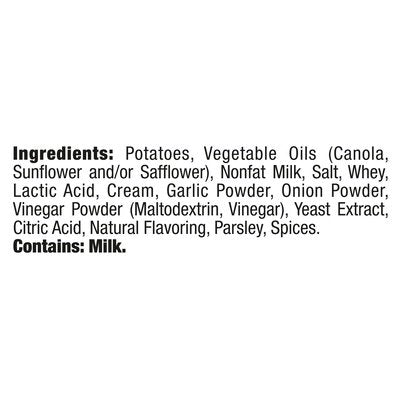 INGREDIENTS: Potatoes, Vegetable Oils (Canola, Sunflower and/or Safflower), Nonfat Milk, Salt, Whey, Lactic Acid, Cream, Garlic Powder, Onion Powder, Vinegar Powder (Maltodextrin, Vinegar), Yeast Extract, Citric Acid, Natural Flavoring, Parsley, Spices.