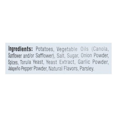 INGREDIENTS: Potatoes, Vegetable Oils (Canola, Sunflower and/or Safflower), Salt, Sugar, Onion Powder, Spices, Torula Yeast, Yeast Extract, Garlic Powder, Jalapeno Pepper Powder, Natural Flavors, Parsley.