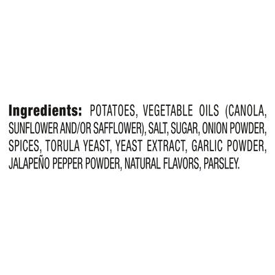 INGREDIENTS: Potatoes, Vegetable Oils (Canola, Sunflower and/or Safflower), Salt, Sugar, Onion Powder, Spices, Torula Yeast, Yeast Extract, Garlic Powder, Jalapeno Pepper Powder, Natural Flavors, Parsley.