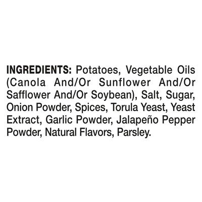INGREDIENTS: Potatoes, Vegetable Oils (Canola and/or Sunflower and/or Safflower and/or Soybean), Salt, Sugar, Onion Powder, Spices, Torula Yeast, Yeast Extract, Garlic Powder, Jalapeno Pepper Powder, Natural Flavors, Parsley.