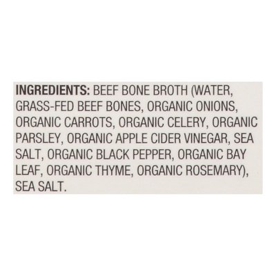 INGREDIENTS: Beef Bone Broth (Water, Grass-Fed Beef Bones, Organic Onions, Organic Carrots, Organic Celery, Organic Parsley, Organic Apple Cider Vinegar, Sea Salt, Organic Black Pepper, Organic Bay Leaf, Organic Thyme, Organic Rosemary), Sea Salt.