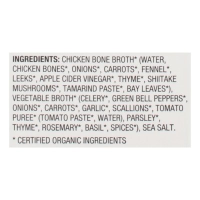INGREDIENTS: Chicken Bone Broth (Certified Organic Ingredients) (Water, Chicken Bones (Certified Organic Ingredients), Onions (Certified Organic Ingredients), Carrots (Certified Organic Ingredients), Fennel (Certified Organic Ingredients), Leeks (Certified Organic Ingredients), Apple Cider Vinegar (Certified Organic Ingredients), Thyme (Certified Organic Ingredients), Shiitake Mushrooms (Certified Organic Ingredients), Tamarind Paste (Certified Organic Ingredients), Bay Leaves (Certified Organic Ingredients)), Vegetable Broth (Certified Organic Ingredients) (Celery (Certified Organic Ingredients), Green Bell Peppers (Certified Organic Ingredients), Onions (Certified Organic Ingredients), Carrots (Certified Organic Ingredients), Garlic (Certified Organic Ingredients), Scallions (Certified Organic Ingredients), Tomato Puree (Certified Organic Ingredients) (Tomato Paste (Certified Organic Ingredients), Water), Parsley (Certified Organic Ingredients), Thyme (Certified Organic Ingredients), Rosemary (Certified Organic Ingredients), Basil (Certified Organic Ingredients), Spices (Certified Organic Ingredients)), Sea Salt.