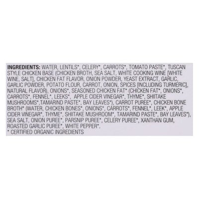 INGREDIENTS: Water, Lentils (Certified Organic Ingredients), Celery (Certified Organic Ingredients), Carrots (Certified Organic Ingredients), Tomato Paste (Certified Organic Ingredients), Tuscan Style Chicken Base (Chicken Broth, Sea Salt, White Cooking Wine White Wine, Salt, Chicken Fat Flavor, Onion Powder, Yeast Extract, Garlic Garlic Powder, Potato Flour, Carrot, Onion, Spices (Including Turmeric), Natural Flavor), Onions (Certified Organic Ingredients), Seasoned Chicken Fat(Certified Organic Ingredients) (Chicken Fat (Certified Organic Ingredients), Onions (Certified Organic Ingredients), Carrots (Certified Organic Ingredients), Fennel (Certified Organic Ingredients), Leeks (Certified Organic Ingredients), Apple Cider Vinegar (Certified Organic Ingredients), Thyme (Certified Organic Ingredients), Shiitake Mushrooms (Certified Organic Ingredients), Tamarind Paste (Certified Organic Ingredients), Bay Leaves (Certified Organic Ingredients)), Carrot Puree (Certified Organic Ingredients), Chicken Bone Broth (Certified Organic Ingredients) (Water, Chicken Bones (Certified Organic Ingredients), Onions (Certified Organic Ingredients), Carrots (Certified Organic Ingredients), Fennel (Certified Organic Ingredients), Leek (Certified Organic Ingredients), Apple Cider Vinegar (Certified Organic Ingredients), Thyme (Certified Organic Ingredients), Shiitake Mushroom (Certified Organic Ingredients), Tamarind Paste (Certified Organic Ingredients), Bay Leaves (Certified Organic Ingredients)), Sea Salt, Onion Puree (Certified Organic Ingredients), Parsnip Puree (Certified Organic Ingredients), Celery Puree (Certified Organic Ingredients), Xanthan Gum, Roasted Garlic Puree (Certified Organic Ingredients), White Pepper (Certified Organic Ingredients).