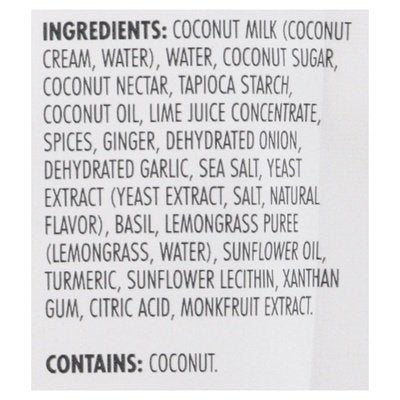 INGREDIENTS: Coconut Milk (Coconut Cream, Water), Water, Coconut Sugar, Coconut Nectar, Tapioca Starch, Coconut Oil, Lime Juice Concentrate, Spices, Ginger, Dehydrated Onion, Dehydrated Garlic, Sea Salt, Yeast Extract (Yeast Extract, Salt, Natural Flavor), Basil, Lemongrass Puree (Lemongrass, Water), Sunflower Oil, Turmeric, Sunflower Lecithin, Xanthan Gum, Citric Acid, Monkfruit Extract.