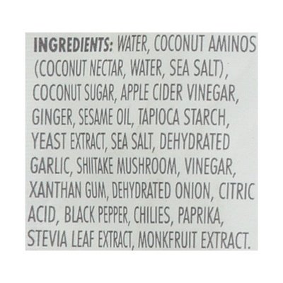 INGREDIENTS: Water, Coconut Aminos (Coconut Nectar, Water, Sea Salt), Coconut Sugar, Apple Cider Vinegar, Ginger, Sesame Oil, Tapioca Starch, Yeast Extract, Sea Salt, Dehydrated Garlic, Shiitake Mushroom, Vinegar, Xanthan Gum, Dehydrated Onion, Citric Acid, Black Pepper, Chilies, Paprika, Stevia Leaf Extract, Monkfruit Extract.