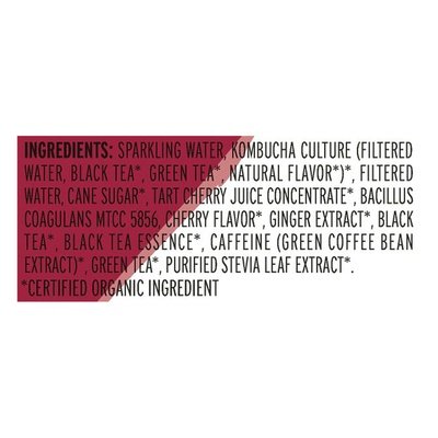 INGREDIENTS: Sparkling Water, Kombucha Culture (Filtered Water, Black Tea (Certified Organic Ingredient), Green Tea (Certified Organic Ingredient), Natural Flavor (Certified Organic Ingredient)) (Certified Organic Ingredient), Filtered Water, Cane Sugar (Certified Organic Ingredient), Tart Cherry Juice Concentrate (Certified Organic Ingredient), Bacillus Coagulans MTCC 5856, Cherry Flavor (Certified Organic Ingredient), Ginger Extract (Certified Organic Ingredient), Black Tea (Certified Organic Ingredient), Black Tea Essence (Certified Organic Ingredient), Caffeine (Green Coffee Bean Extract) (Certified Organic Ingredient), Green Tea (Certified Organic Ingredient), Purified Stevia Leaf Extract (Certified Organic Ingredient).