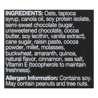 INGREDIENTS: Oats, Tapioca Syrup, Canola Oil, Soy Protein Isolate, Semi-Sweet Chocolate (Sugar, Unsweetened Chocolate, Cocoa Butter, Soy Lecithin, Vanilla Extract), Cane Sugar, Raisin Paste, Cocoa Powder, Millet, Molasses, Buckwheat, Amaranth, Quinoa, Natural Flavor, Cinnamon, Sea Salt, Vitamin E (Tocopherols to Maintain Freshness).