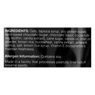 INGREDIENTS: Oats, Tapioca Syrup, Soy Protein Isolate, Semi-Sweet Chocolate (Sugar, Chocolate Liquor, Cocoa Butter, Soy Lecithin, Vanilla Extract), Cane Sugar, Canola Oil, Millet, Cocoa Powder, Brown Rice, Buckwheat, Natural Flavor, Amaranth, Quinoa, Sea Salt, Brown Rice Syrup, Vitamin E (to Maintain Freshness).