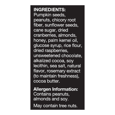INGREDIENTS: Pumpkin Seeds, Peanuts, Chicory Root Fiber, Sunflower Seeds, Cane Sugar, Dried Cranberries, Almonds, Honey, Palm Kernel Oil, Glucose Syrup, Rice Flour, Dried Raspberries, Unsweetened Chocolate, Alkalized Cocoa, Soy Lecithin, Sea Salt, Natural Flavor, Rosemary Extract (to Maintain Freshness),Cocoa Butter.