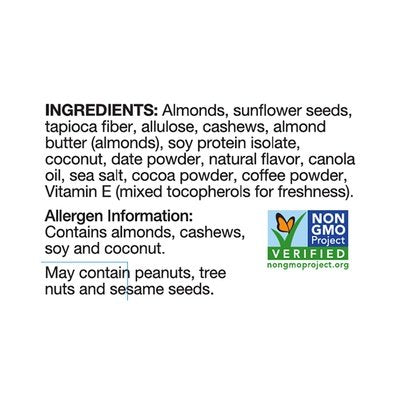 INGREDIENTS: Almonds, Sunflower Seeds, Tapioca Fiber, Allulose, Cashews, Almond Butter (Almonds), Soy Protein Isolate, Coconut, Date Powder, Natural Flavor, Canola Oil, Sea Salt, Cocoa Powder, Coffee Powder, Vitamin E (Mixed Tocopherols for Freshness).