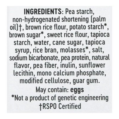 INGREDIENTS: Pea Starch, Non-Hydrogenated Shortening (Palm Oil)(RSPO Certified), Brown Rice Flour, Potato Starch (Not a Product of Genetic Engineering), Brown Sugar (Not a Product of Genetic Engineering), Sweet Rice Flour, Tapioca Starch, Water, Cane Sugar, Tapioca Syrup, Rice Bran, Molasses (Not a Product of Genetic Engineering), Salt, Sodium Bicarbonate, Pea Protein, Natural Flavor, Pea Fiber, Inulin, Sunflower Lecithin, Mono Calcium Phosphate, Modified Cellulose, Guar Gum.