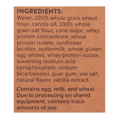 INGREDIENTS: 100% Whole Grain Wheat Flour, Water, 100% Whole Grain Oat Flour, Canola and/or Sunflower and/or Soybean Oil, Vital Wheat Gluten, Sugar, Eggs, Whey Protein Isolate, Buttermilk, Natural Flavor, Sunflower and/or Soybean and/or Canola Lecithin, Leavening (Sodium Acid Pyrophosphate, Baking Soda), Sea Salt, Vanilla Extract.