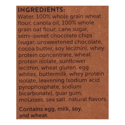 INGREDIENTS: 100% Whole Grain Wheat Flour, Water, Canola and/or Sunflower and/or Soybean Oil, 100% Whole Grain Oat Flour, Vital Wheat Gluten, Eggs, Sugar, Semi-Sweet Chocolate Chips (Sugar, Unsweetened Chocolate, Cocoa Butter, Soy Lecithin), Whey Protein Isolate, Buttermilk, Sunflower and/or Soybean and/or Canola Lecithin, Natural Flavors, Leavening (Sodium Acid Pyrophosphate, Baking Soda), Molasses, Sea Salt.