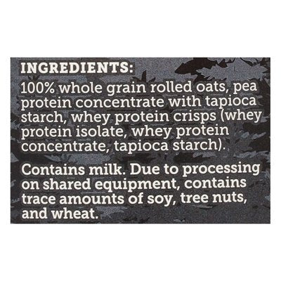 INGREDIENTS: 100% Whole Grain Rolled Oats, Pea Protein Concentrate with Tapioca Starch, Whey Protein Crisps (Whey Protein Isolate, Whey Protein Concentrate, Tapioca Starch).