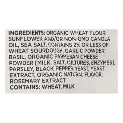 DESCRIPTION: Sourdough bread, olive oil, sea salt, garlic, basil, parmesan. No artificial flavors, dyes or preservatives. Non-GMO Project verified. nongmoproject.org. Real bread makes real croutons. All natural. Taste the difference. Mambo Italiano: Il Classico. How can you beat garlic, basil and Parmesan? Hint: You can't. Buon appetito. Mangia! Ok that's all the Italian we know. Perfect for salad, soup, snacking and so much more. Salad, soup, snack, breadcrumbs, eggs, crushed on pasta, hummus, feed the birds. Bread is joy: We're two brothers obsessed with bread. While other kids screamed for ice cream, we begged for a beautiful crusty sourdough loaf (thanks, (at)mom). Now we bring that same excitement to every bag of Kooshy croutons. Starting with the highest quality ingredients, we make a delicious loaf of real sourdough bread. Then we lovingly cut, season, and bake it once more to get that perfect crouton crunch-after all, bread is joy! Sourdough bread nothing artificial all natural. kooshy.com. Follow us pleeease: Instagram. (at)kooshy. Tik Tok. (at)kooshycroutons. Twitter. (at)kooshycroutons. < Organic Wheat Flour, Sunflower and/or Non-GMO Canola Oil, Sea Salt, Contains 2% or Less of: Wheat Sourdough, Garlic Powder, Basil, Organic Parmesan Cheese Powder [Milk, Salt, Cultures, Enzymes], Parsley, Black Pepper, Yeast, Yeast Extract, Organic Natural Flavor, Rosemary Extract.