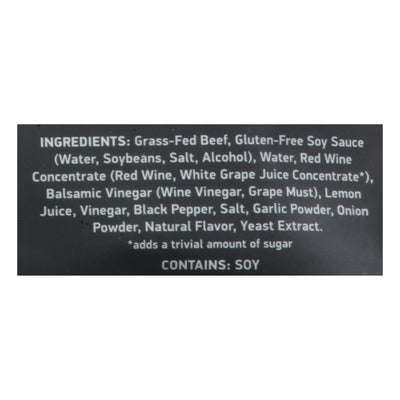 INGREDIENTS: Grass-Fed Beef, Gluten-Free Soy Sauce (Water, Soybeans, Salt, Alcohol), Water, Red Wine Concentrate (Red Wine, White Grape Juice Concentrate (Adds a Trivial Amount of Sugar)), Balsamic Vinegar (Wine Vinegar, Grape Must), Lemon Juice, Vinegar, Black Pepper, Salt, Garlic Powder, Onion Powder, Natural Flavor, Yeast Extract.