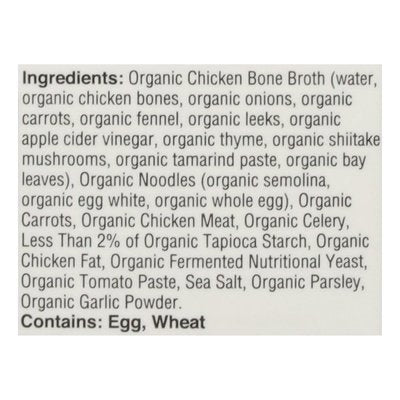 INGREDIENTS: Organic Chicken Bone Broth (Water, Organic Chicken Bones, Organic Onions, Organic Carrots, Organic Fennel, Organic Leeks, Organic Apple Cider Vinegar, Organic Thyme, Organic Shiitake Mushrooms, Organic Tamarind Paste, Organic Bay Leaves), Organic Noodles (Organic Semolina, Organic Egg White, Organic Whole Egg), Organic Carrots, Organic Chicken Meat, Organic Celery, Less than 2% of Organic Tapioca Starch, Organic Chicken Fat, Organic Fermented Nutritional Yeast, Organic Tomato Paste, Sea Salt, Organic Parsley, Organic Garlic Powder.