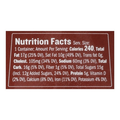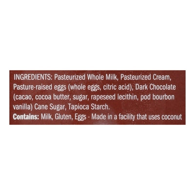 INGREDIENTS: Pasteurized Whole Milk, Pasteurized Cream, Pasture-Raised Eggs (Whole Eggs, Citric Acid), Dark Chocolate (Cacao, Cocoa Butter, Sugar, Rapeseed Lecithin, Pod Bourbon Vanilla), Cane Sugar, Tapioca Starch.