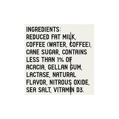 INGREDIENTS: Reduced Fat Milk, Coffee (Water, Coffee), Cane Sugar, Acacia, Natural Flavor, Disodium Phosphate, Trisodium Phosphate, Lactase Enzyme, Gellan Gum, Vitamin D3.