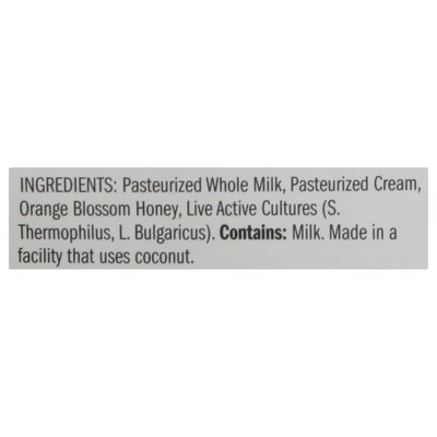 INGREDIENTS: Pasteurized Whole Milk, Pasteurized Cream, Orange Blossom Honey, Live Active Cultures (S. Thermophilus, L. Bulgaricus).