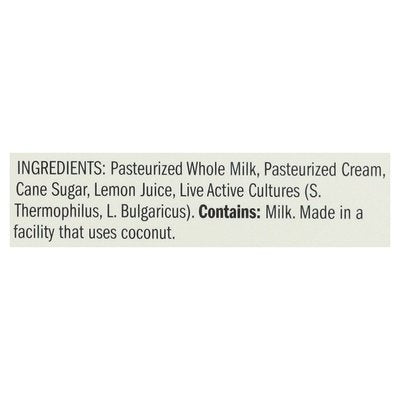INGREDIENTS: Pasteurized Whole Milk, Pasteurized Cream, Cane Sugar, Lemon Juice, Live Active Cultures (S. Thermophilus, L. Bulgaricus).