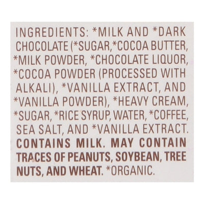 INGREDIENTS: Milk (Organic) and Dark (Organic) Chocolate (Sugar (Organic), Cocoa Butter (Organic), Milk Powder (Organic), Chocolate Liquor (Organic), Cocoa Powder (Organic) (Processed with Alkali), Vanilla Extract (Organic), and Vanilla Powder (Organic)), Heavy Cream (Organic), Sugar (Organic), Rice Syrup (Organic), Water, Coffee (Organic), Sea Salt, and Vanilla Extract (Organic).