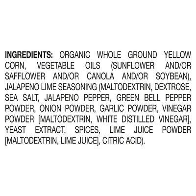 INGREDIENTS: Organic Whole Ground Yellow Corn, Vegetable Oils (Sunflower and/or Safflower and/or Canola and/or Soybean), Jalapeno Lime Seasoning (Maltodextrin, Dextrose, Sea Salt, Jalapeno Pepper, Green Bell Pepper Powder, Onion Powder, Garlic Powder, Vinegar Powder [Maltodextrin, White Distilled Vinegar], Yeast Extract, Spices, Lime Juice Powder [Maltodextrin, Lime Juice], Citric Acid).