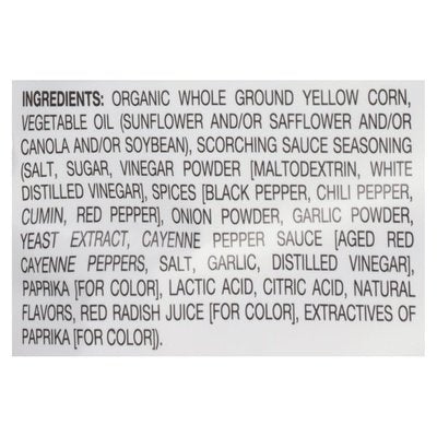 INGREDIENTS: Organic Whole Ground Yellow Corn, Vegetable Oil (Sunflower and/or Safflower and/or Canola and/or Soybean), Scorching Sauce Seasoning (Salt, Sugar, Vinegar Powder [Maltodextrin, White Distilled Vinegar], Spices [Black Pepper, Chili Pepper, Cumin, Red Pepper], Onion Powder, Garlic Powder, Yeast Extract, Cayenne Pepper Sauce [Aged Red Cayenne Peppers, Salt, Garlic, Distilled Vinegar], Paprika [for Color], Lactic Acid, Citric Acid, Natural Flavors, Red Radish Juice [for Color], Extractives of Paprika [for Color]).