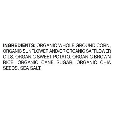 INGREDIENTS: Organic Whole Ground Corn, Organic Sunflower and/or Organic Safflower Oils, Organic Sweet Potato, Organic Brown Rice, Organic Cane Sugar, Organic Chia Seeds, Sea Salt.