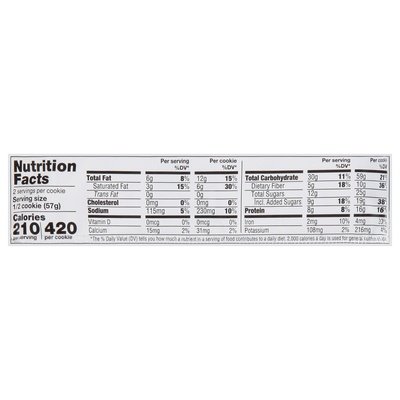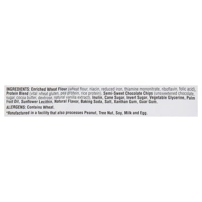 INGREDIENTS: Enriched Wheat Flour (Wheat Flour, Niacin, Reduced Iron, Thiamine Mononitrate, Riboflavin, Citric Acid), Protein Blend (Vital Wheat Gluten, Pea Protein, Rice Protein), Chicory Root Fiber, Semi-Sweet Chocolate Chips (Unsweetened Chocolate, Sugar, Cocoa Butter, Dextrose, Natural Vanilla Extract), Cane Sugar, Invert Sugar, Vegetable Glycerine, Palm Fruit Oil, Sunflower Lecithin, Natural Flavor, Baking Soda, Salt, Xanthan Gum, Guar Gum.