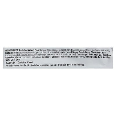 INGREDIENTS: Enriched Wheat Flour (Wheat Flour, Niacin, Reduced Iron, Thiamine Mononitrate, Riboflavin, Folic Acid), Protein Blend (Vital Wheat Gluten, Pea Protein, Rice Protein), Chicory Root Fiber, Invert Sugar, Semi-Sweet Chocolate Chips (Unsweetened Chocolate, Sugar, Cocoa Butter, Dextrose, Natural Vanilla Extract), Cane Sugar, Palm Fruit Oil, Vegetable Glycerin, Cocoa Processed with Alkali, Sunflower Lecithin, Molasses, Natural Flavor, Baking Soda, Salt, Xanthan Gum, Guar Gum.
