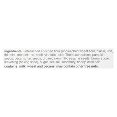 INGREDIENTS: Unbleached Enriched Flour (Unbleached Wheat Flour, Niacin, Iron, Thiamine Mononitrate, Riboflavin, Folic Acid), Thompson Raisins, Pumpkin Seeds, Pecans, Flax Seeds, Organic Skim Milk, Sesame Seeds, Brown Sugar, Leavening (Baking Soda), Refinery Syrup, Sea Salt, Rosemary, Honey, Citric Acid.