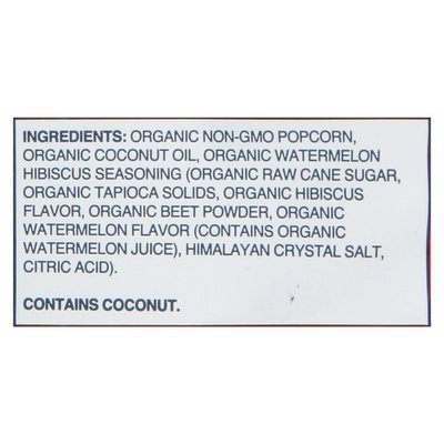 INGREDIENTS: Organic Non-GMO Popcorn, Organic Coconut Oil, Organic Watermelon Hibiscus Seasoning (Organic Raw Cane Sugar, Organic Tapioca Solids, Organic Hibiscus Flavor, Organic Beet Powder, Organic Watermelon Flavor (Contains Organic Watermelon Juice), Himalayan Crystal Salt, Citric Acid).