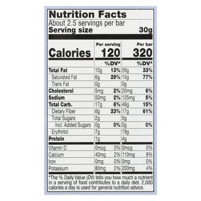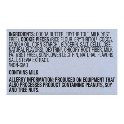 INGREDIENTS: Cocoa Butter, Erythritol (Non-GMO), Milk (rBST Free), Cookie Pieces (Rice Flour, Erythritol (Non-GMO), Cocoa, Canola Oil, Corn Starch (Non-GMO), Glycerin, Salt, Cellulose, Natural Flavors), Dextrin (Non-GMO), Chicory Root Fiber, Milk Fat (rBST Free), Sunflower Lecithin, Natural Flavors, Salt, Stevia Extract.