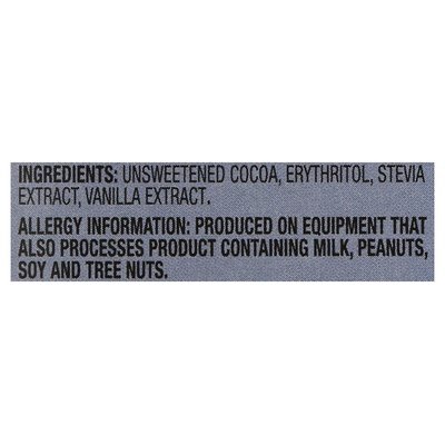 INGREDIENTS: Unsweetened Cocoa, Erythritol, Stevia Extract, Vanilla Extract.
