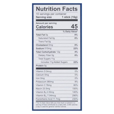 INGREDIENTS: Pure Cane Sugar, Dextrose, Citric Acid, Salt, Potassium Citrate, Sodium Citrate, Dipotassium Phosphate, Silicon Dioxide, Rebaudioside-a (Stevia Leaf Extract), Natural Flavors, Vitamin C (Ascorbic Acid), Vitamin B3 (Niacinamide), Vitamin B5 (D-Calcium Pantothenate), Vitamin B6 (Pyridoxine Hydrochloride), Vitamin B12 (Cyanocobalamin).