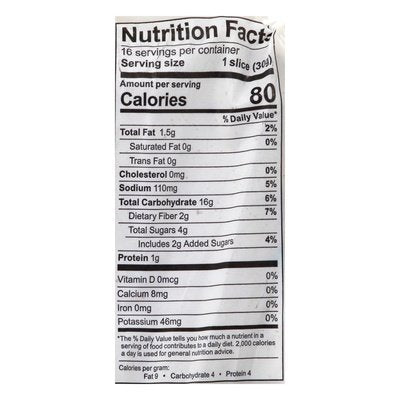 INGREDIENTS: Water, Gluten-Free Flour Blend (Modified Tapioca Starch, Potato Starch, Corn Starch, Brown Rice Flour), Raisins, Sunflower Oil, Dextrose, Cane Sugar, Psyllium Husk, Yeast, Pea Fiber, Modified Cellulose, Salt, Rice Bran, Cultured Cane Sugar, Cellulose Gum, Cinnamon.