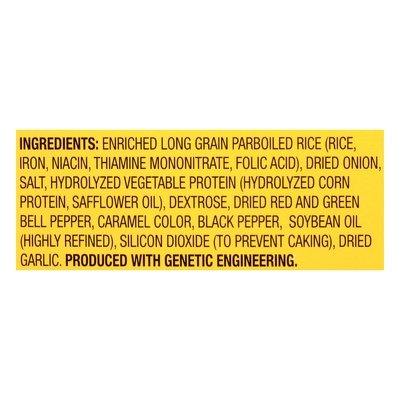 INGREDIENTS: Enriched Long Grain Parboiled Rice (Rice, Iron, Niacin, Thiamine Mononitrate, Folic Acid), Dried Onion, Salt, Hydrolyzed Vegetable Protein (Hydrolyzed Corn Protein, Safflower Oil), Dextrose, Dried Red and Green Bell Pepper, Caramel Color, Black Pepper, Soybean Oil (Highly Refined), Silicon Dioxide (to Prevent Caking), Dried Garlic.