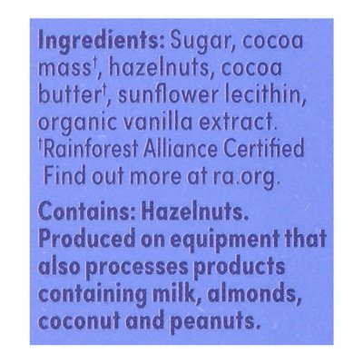 INGREDIENTS: Sugar, Cocoa Mass (Rainforest Alliance Certified Find Out More at ra.org), Hazelnuts, Cocoa Butter (Rainforest Alliance Certified Find Out More at ra.org), Sunflower Lecithin, Organic Vanilla Extract.