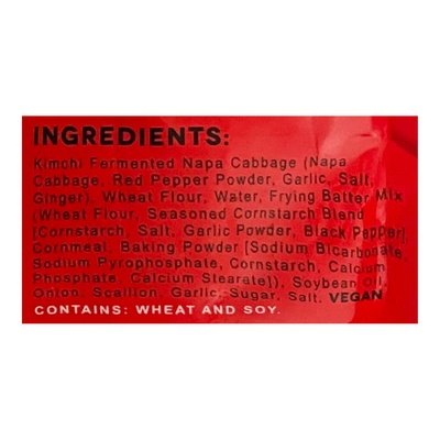 INGREDIENTS: Kimchi Fermented Napa Cabbage (Napa Cabbage, Red Pepper Powder, Garlic, Salt, Ginger), Wheat Flour, Water, Frying Batter Mix (Wheat Flour, Seasoned Cornstarch Blend [Cornstarch, Salt, Garlic Powder, Black Pepper], Cornmeal, Baking Powder [Sodium Bicarbonate, Sodium Pyrophosphate, Cornstarch, Calcium Phosphate, Calcium Stearate]), Soybean Oil, Onion, Scallion, Garlic, Sugar, Salt.