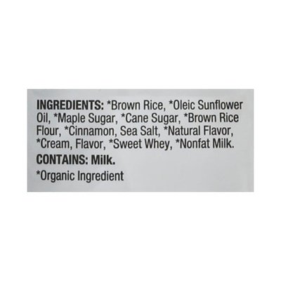 INGREDIENTS: Brown Rice (Organic Ingredient), Oleic Sunflower Oil (Organic Ingredient), Maple Sugar (Organic Ingredient), Cane Sugar (Organic Ingredient), Brown Rice Flour (Organic Ingredient), Cinnamon (Organic Ingredient), Sea Salt, Natural Flavor (Organic Ingredient), Cream (Organic Ingredient), Flavor, Sweet Whey (Organic Ingredient), Nonfat Milk (Organic Ingredient).