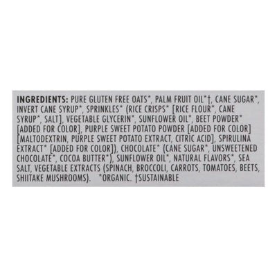INGREDIENTS: Pure Gluten Free Oats (Organic), Palm Fruit Oil (Organic) (Sustainable), Cane Sugar (Organic), Invert Cane Syrup (Organic), Sprinkles (Organic) (Rice Crisps (Organic) [Rice Flour (Organic), Cane Syrup (Organic), Salt], Vegetable Glycerin (Organic), Sunflower Oil (Organic), Beet Powder (Organic) [Added for Color], Purple Sweet Potato Powder [Added for Color] [Maltodextrin, Purple Sweet Potato Extract, Citric Acid], Spirulina Extract (Organic) [Added for Color]), Chocolate (Organic) (Cane Sugar (Organic), Unsweetened Chocolate (Organic), Cocoa Butter (Organic)), Sunflower Oil (Organic), Natural Flavors (Organic), Sea Salt, Vegetable Extracts (Spinach, Broccoli, Carrots, Tomatoes, Beets, Shiitake Mushrooms).