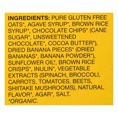 INGREDIENTS: Pure Gluten Free Oats (Organic), Agave Syrup (Organic), Brown Rice Syrup (Organic), Chocolate Chips (Organic) (Cane Sugar (Organic), Unsweetened Chocolate (Organic), Cocoa Butter (Organic)), Dried Banana Pieces (Organic) (Dried Bananas (Organic), Banana Powder (Organic)), Sunflower Oil (Organic), Brown Rice Crisps (Organic), Inulin (Organic), Vegetable Extracts (Spinach, Broccoli, Carrots, Tomatoes, Beets, Shiitake Mushrooms), Natural Flavor (Organic), Agar (Organic), Salt.