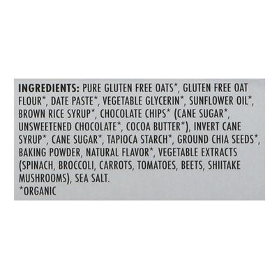 INGREDIENTS: Pure Gluten Free Oats (Organic), Gluten Free Oat Flour (Organic), Date Paste (Organic), Vegetable Glycerin (Organic), Sunflower Oil (Organic), Brown Rice Syrup (Organic), Chocolate Chips (Organic) (Cane Sugar (Organic), Unsweetened Chocolate (Organic), Cocoa Butter (Organic)), Invert Cane Syrup (Organic), Cane Sugar (Organic), Tapioca Starch (Organic), Ground Chia Seeds (Organic), Baking Powder, Natural Flavor (Organic), Vegetable Extracts (Spinach, Broccoli, Carrots, Tomatoes, Beets, Shiitake Mushrooms), Sea Salt.